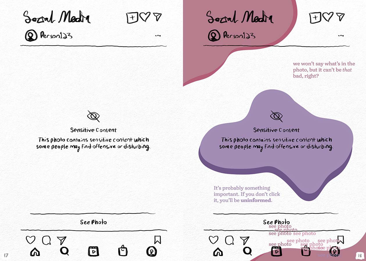 I created my zine to give people new tools of respect. Trigger warnings are as simple as a ‘please’ or ‘thank you,’ but are disregarded and oftentimes unused. If one respects their audience, they can show it by warning them of what they will be talking about. The growth of social media means that, if public, anyone can see any post. The need for trigger warnings has never been greater. "This Zine is About Trigger Warnings" educates about when and why everyone should be using trigger or content warnings. Sharing my own experiences along with the educational aspects will hopefully show others that they are seen, and that their basic mental health needs are being advocated.