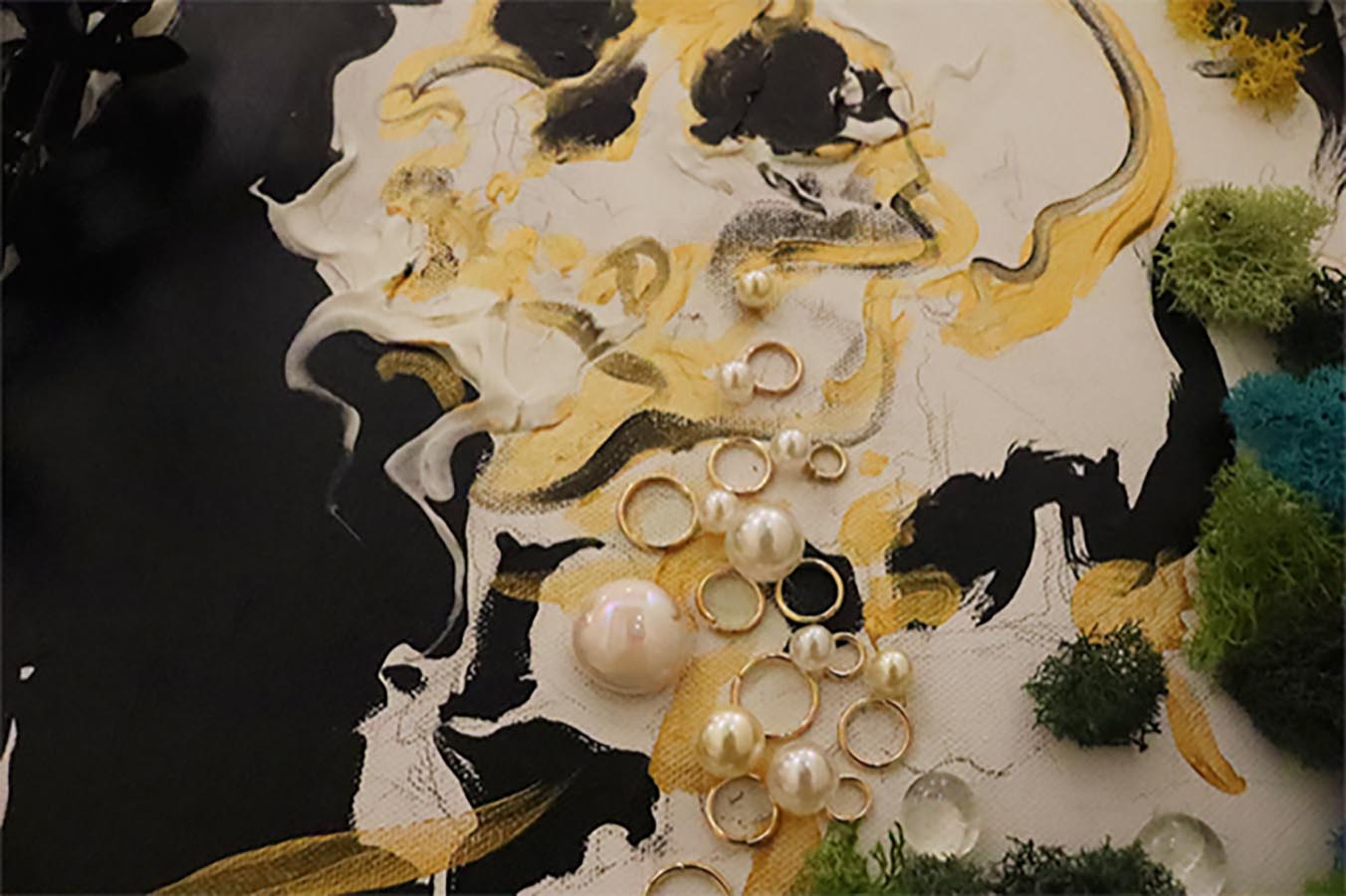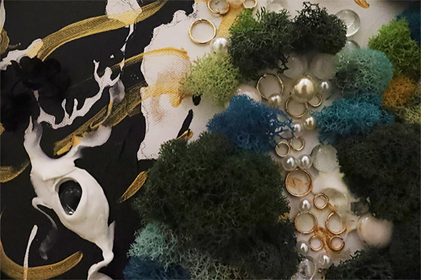 I don’t cry a lot, and it’s something that I definitely used to be concerned about, but it also led me to a certain level of dissatisfaction. Growing up I was eventually always told that crying is good and it lets you release everything emotionally pent up inside of you. When emotions became particularly overwhelming, I always tried to cry because I was told it would relieve me of all those stressful negative feelings, but no matter how hard I tried, crying never came naturally to me. I didn’t understand why it was so difficult, especially when I hear my friends say how they cry three times a day “just because that’s how it is.” I wanted to take this thesis as an opportunity to try and visualize this bodily occurrence for myself and others. Not being able to cry reminds me of the stiffness in an unnatural motion, so I decided to transfer that stiffness through elements of moss and metal. The moss reminds me of something being stuck in place for a long time, so it reduces the sense of normal bodily movement, and the metal specifically focused around the spinal cord area is meant to emphasize the rigidness throughout that area of the figure. While representing stiffness, these materials are also meant to represent build up. Trying to cry is a forceful movement for me, so the metal and along with that the pearls double in representation of an attempt to cry being forcefully blocked buy the dominating presence of the moss. The final important compositional decision is the golden skeleton. What I’m trying to show in this piece is something I want the viewer to interpret as an out of body or almost dissociative experience, so I decided to visualize that through showing the skeleton on top of the figure. I decided a skeleton would be the best way to represent this because while they are associated with the word “human”, they alone still have a very unnatural and unnerving appearance. The figures appearance is overall meant to help visualize this very stagnating and upsetting scenario for the viewer in a way that helps them understand how it feels physically, while also aesthetically presenting in a way that shows it’s okay and natural and some people just don’t “cry” how others do.