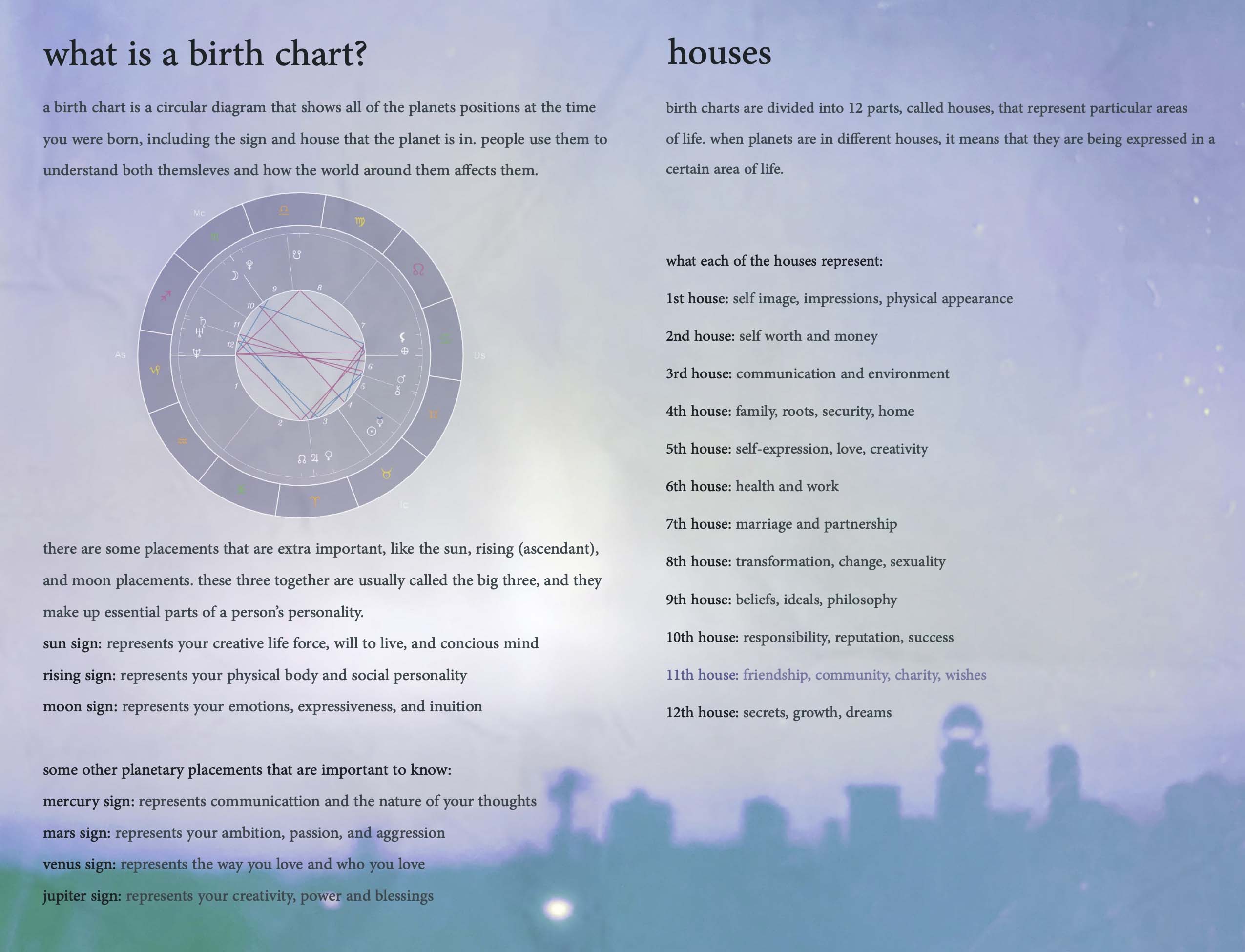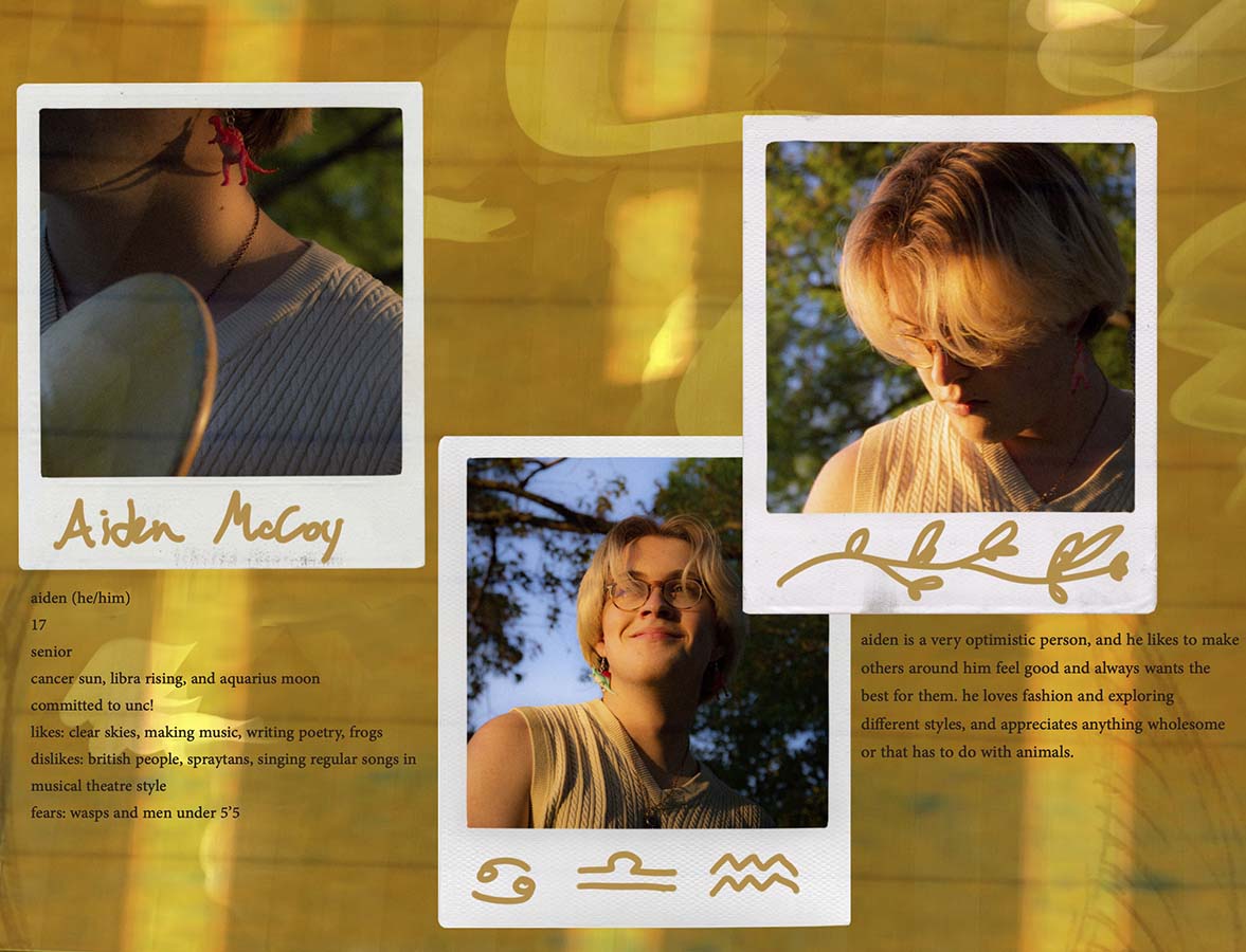 “Eleventh House” is an informational zine about astrology as well as my friends. I wanted to combine these two elements because astrology is study of the movements of planets affecting humans. The goal for this zine was to combine my love for my friends and love for astrology by capturing them at some of their best moments while also letting their astrological placements shine through. I created bios for each of them so the viewer could get to know my friends a bit better, and I wanted this piece (especially the bios) to leave the viewer with a sentimental, nostalgic feeling.