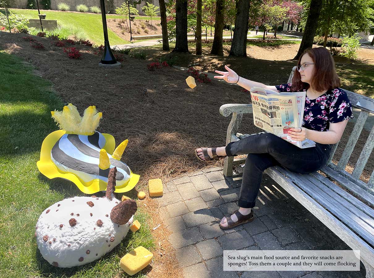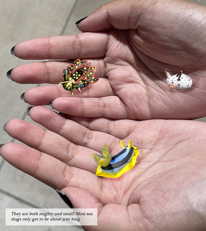 In creating my giant sea slugs, I wanted to bring these tiny amazing creatures from the tropical waters to the center stage, making them impossible to overlook. In actuality, these fellas are only about 3 centimeters long, and with over 3,000 species, very little is known about their biology. However, each new piece of information discovered has led to bursts of biological innovation, from cancer treatments to insights on climate change. Their vibrant blades communicate menace and danger, yet their genetics have helped hundreds. Inspired by their evolutionary excellence, I want to broadcast their information to the world.