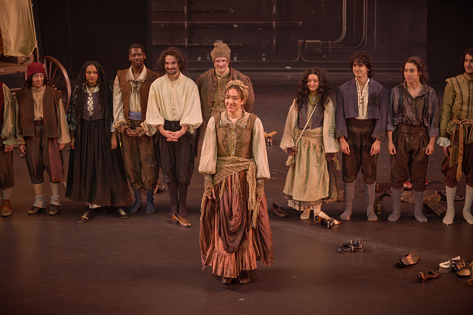 Alyssa James taking a bow for "Mother Courage and her Children" directed by Carl Forsman in Spring 2023. James is playing Horatio in "Hamlet." / Photo: Wayne Reich
